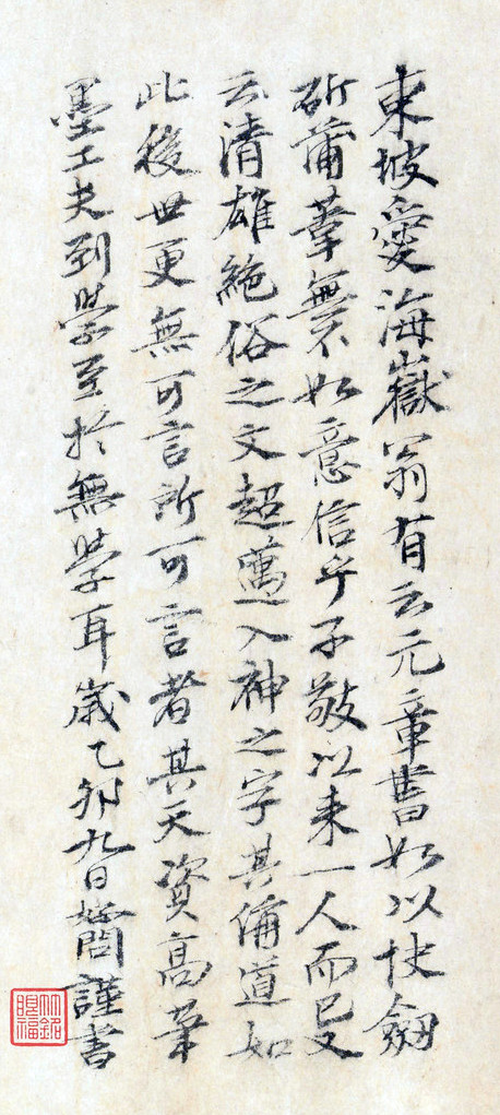 劉庠(りゅうしょう)の幕に入れなかった後、漫遊し杭州へ赴く途中、蘇州を経た時《呉江舟中詩巻》を書くか(曹宝麟説)
